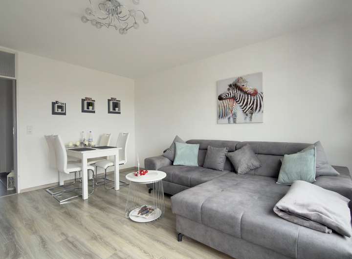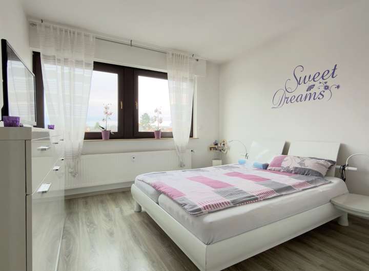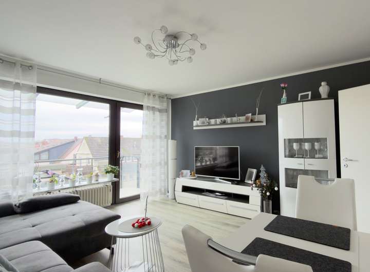 Decken und Wände in klassischem Weiß verleihen den Räumen ein zeitloses und stilvolles Ambiente. Der Grundriss überzeugt durch seine praktische Aufteilung und die moderne Ausstattung.