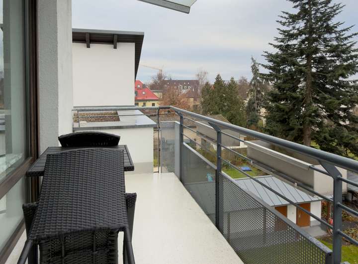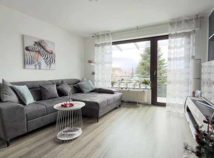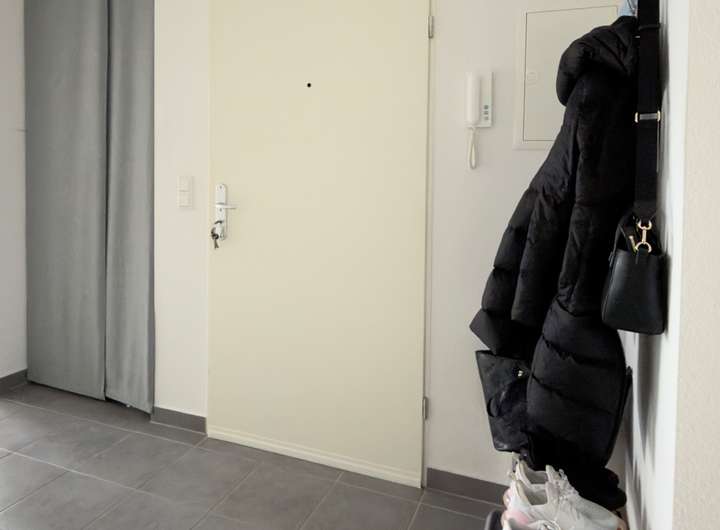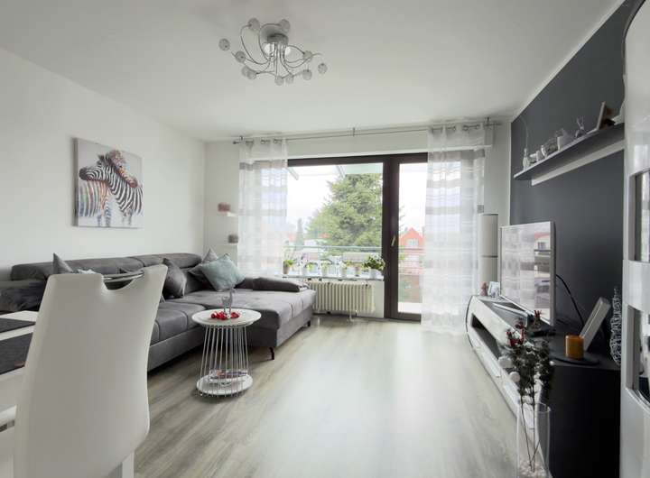Vom Flur gelangt man in den einladenden Wohnbereich mit direktem Zugang zum Balkon. Eines der Highlights ist Ausrichtung nach Westen - hier genießt man den Blick ins Grüne sowie entspannte Abendstunden in ruhiger Umgebung.