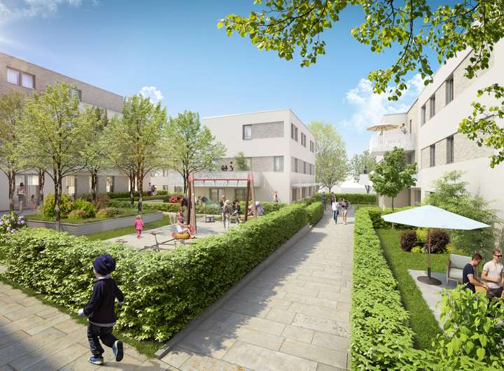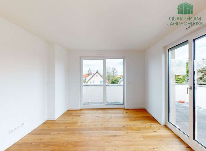 Insgesamt entstehen im Quartier am Jagdschloss 74 Wohnungen, sowie eine Tiefgarage mit 171 PKW-Stellplätzen. Die Außenflächen sowie der Innenbereich sind mit viel Grün gestaltet und bieten auch einen Spielbereich für die Jüngsten.