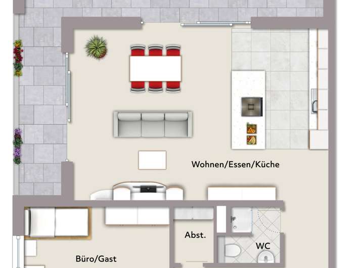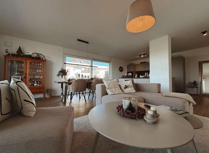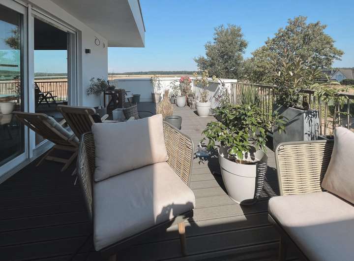 Vom Wohn- und Essbereich gelangen Sie schließlich auf die Dachterrasse, welche sich wie ein erweitertes Wohnzimmer im Freien anfühlt. Hier können Sie an warmen Tagen Ihr Frühstück nach draußen verlegen, mit einem Buch in der Hand die Sonne genießen oder den Feierabend bei einem Glas Wein ausklingen lassen, während die frische Luft und die ruhige Umgebung für eine besondere Entspannung sorgen. Mit liebevollen Pflanzen, gemütlichen Gartenmöbeln oder stimmungsvoller Beleuchtung verwandeln Sie diesen Außenbereich in Ihre persönliche kleine Oase, in der laue Sommerabende, Grillmomente mit Freunden und stille Augenblicke unter freiem Himmel gleichermaßen ihren Platz finden.