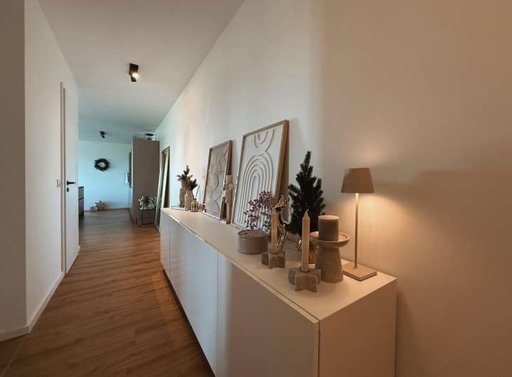 Sobald Sie das Haus betreten, empfängt Sie ein freundliches, ordentlich gepflegtes Treppenhaus. Sie öffnen die Wohnungstür und treten in einen einladenden Flur, der Ihnen mit seiner angenehmen Breite und wohltuend ruhigen Ausstrahlung bereits das Gefühl vermittelt, nach Hause zu kommen. Hier finden Mäntel, Taschen und Schuhe ihren ganz selbstverständlichen Platz, sodass der Alltag strukturiert und geordnet beginnen und enden kann – ein Detail, das den täglichen Komfort spürbar erhöht.