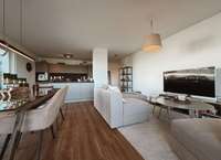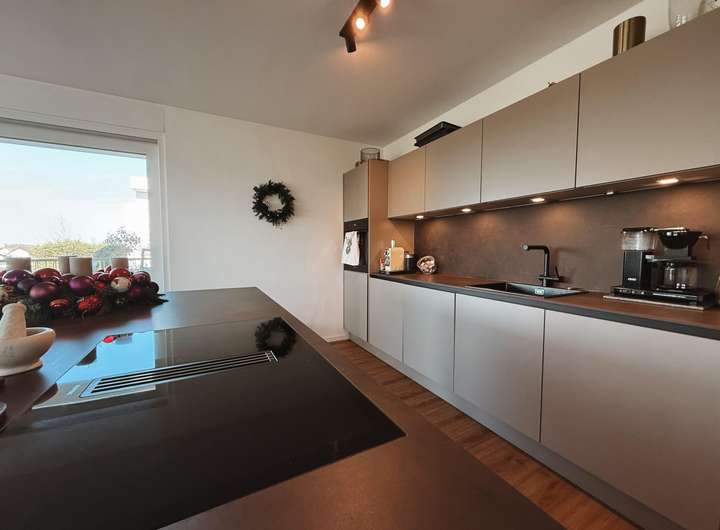 Die kommunikative Raumgestaltung spiegelt sich auch in der Anordnung der Küche wieder. Diese hochwertige Küche wird Ihnen vom Eigentümer gestellt und wird Ihnen auf Anhieb gut „schmecken“. Die Anordnung der Schränke und Arbeitsflächen ist durchdacht, sodass Sie kurze Wege, praktische Ablagen und ausreichend Stauraum für Ihre Küchenutensilien genießen können. Ob Sie ein schnelles Frühstück zubereiten, ein aufwendiges Menü kochen oder am Wochenende gemeinsam backen – diese Küche unterstützt Sie bei all Ihren kulinarischen Ideen und wird schnell zu einem Ort, an dem köstliche Düfte, Lachen und lebendiger Alltag zusammenkommen.
