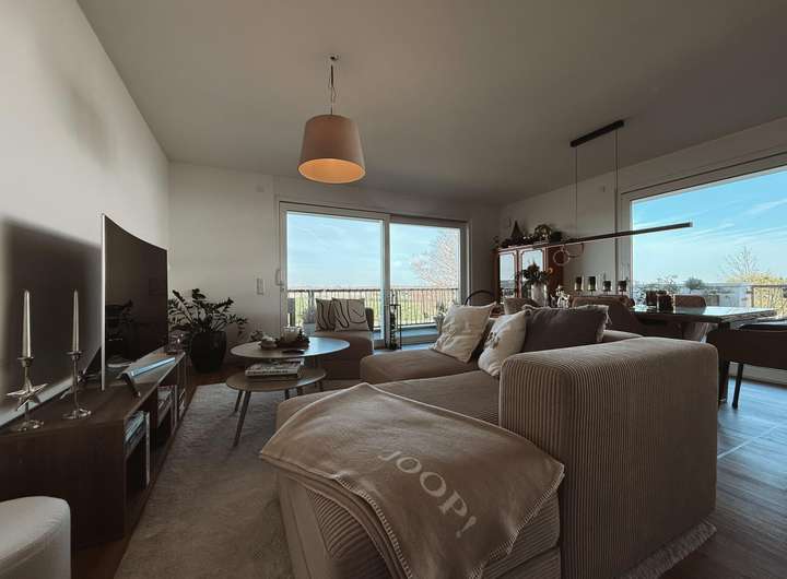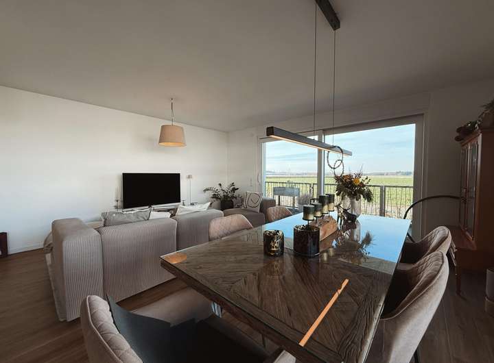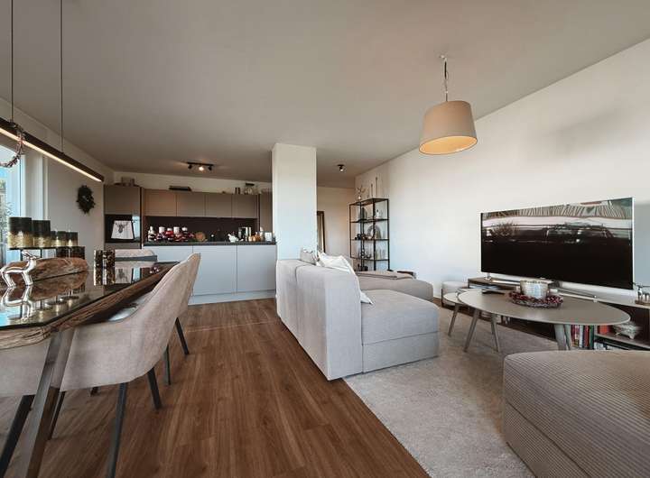 Über die Diele gelangen Sie direkt in den großzügigen Wohn- und Essbereich, der sich wie ein behaglicher Mittelpunkt des täglichen Lebens präsentiert. Die bodentiefen Fensterfronten lassen reichlich Tageslicht hinein und schaffen eine helle, freundliche Atmosphäre, in der Sie morgens mit einer Tasse Kaffee auf dem Sofa sitzen oder abends entspannt den Tag ausklingen lassen können. Die Proportionen des Raumes ermöglichen eine individuelle Möblierung – ob gemütliche Sofalandschaft, elegantes Sideboard oder ein kleiner Lesesessel in Ihrer persönlichen Lieblingsecke, hier entfaltet sich ein Wohngefühl, das Geborgenheit und Freiheit harmonisch vereint. Platz für Ihren Essbereich finden Sie gleichwohl. Ein großer Esstisch fügt sich mühelos ein und wird zum Platz für lange Gespräche, Kindergeburtstage, Weihnachtsessen oder spontane Dinner mit Freunden. Die Verbindung zwischen Wohnen und Essen sorgt dafür, dass Sie stets in Kontakt mit Ihren Liebsten bleiben, egal ob jemand noch in der Küche kocht oder bereits am Tisch sitzt.