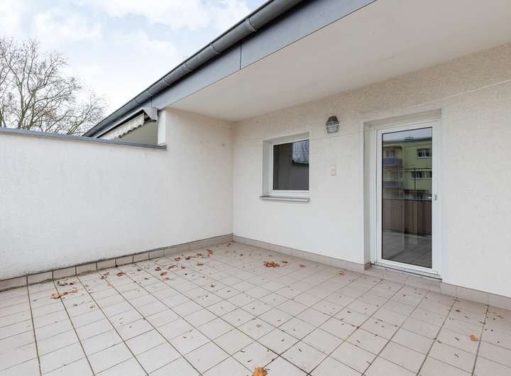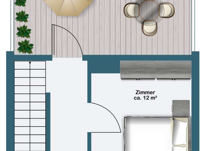 Im ausgebauten Dachgeschoss befindet sich ein weiteres Zimmer, das sich vielseitig nutzen lässt, sowie eine großzügige Dachterrasse mit circa 17 m² Fläche.