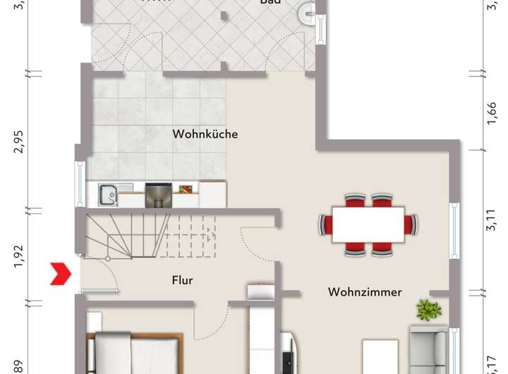 EG: Wohn-/Esszimmer mit offener Wohnküche, Schlafzimmer, Bad/HWR, Flur