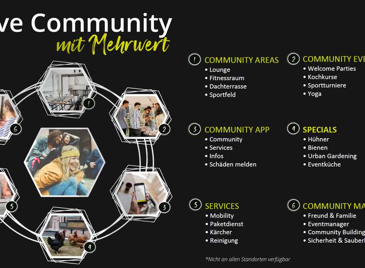Services: Smartphone-App, Community Manager, Community-Events inkl. Catering, Leihartikel, Apartmentreinigung, Hemdreinigungsservice, Paketannahmeservice, Playstation und vieles mehr…
