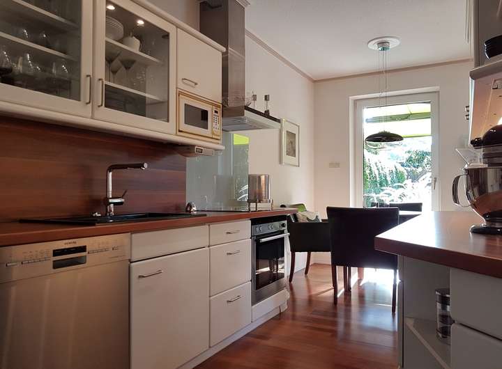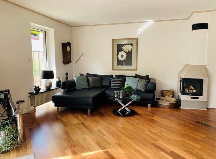 Die ca. 100 m² Wohnfläche verteilen sich im Erdgeschoss auf die offene Küche, das Gäste-WC sowie den großzügigen Wohn- und Essbereich mit Heizkamin und Zugang zum Garten. Die durchdacht gestaltete und hochwertig eingerichtete Küche verläuft offen zum hellen Essbereich hin. Die weißen Fronten harmonieren mit den Edelstahl-Elektrogeräten und den Holz-Arbeitsflächen. Das Echtholzparkett, mit dem warmen Farbton, prägt auf dieser Ebene zusätzlich den wohnlichen Charme.