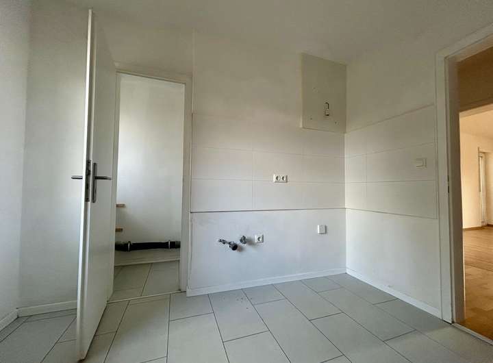 Das Tageslichtbad ist mit einer Dusche ausgestattet. Eine Nische bietet Platz für eine Waschmaschine und einen Trockner. Die Küche verfügt über einen angrenzenden, praktischen Abstellraum. Im Flur sorgen eingebaute Schränke für zusätzlichen Stauraum.