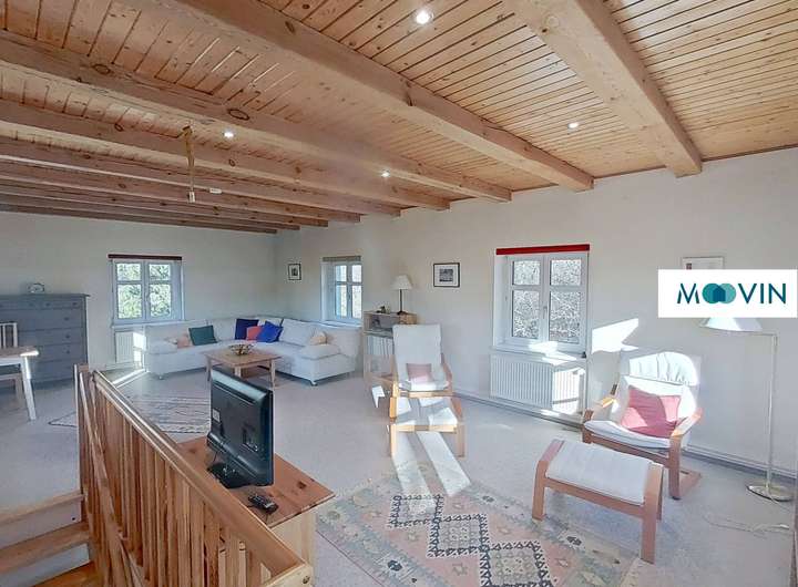 Herzstück des schönen Altbauhauses, das 1995 umfassend saniert wurde, ist das offene und hell gestaltete Hauptwohnzimmer in der obersten Etage des Hauses. Als krönender Abschluss des Mietobjekts finden Sie hier einen lichtdurchfluteten und großen Wohnraum vor, der mit offen gelegten Holzbalken an der Decke von einer urigen und gemütlichen Atmosphäre erfüllt wird.
