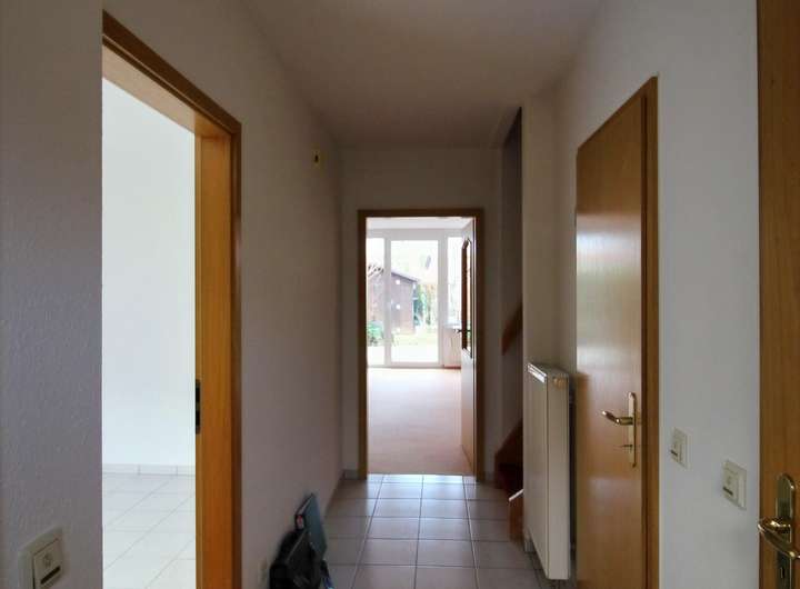 Die Wohnfläche von ca. 113 Quadratmetern verteilt sich dort auf großem Wohnzimmer, Flur, Küche, Gäste-WC und Abstellraum im Erdgeschoß