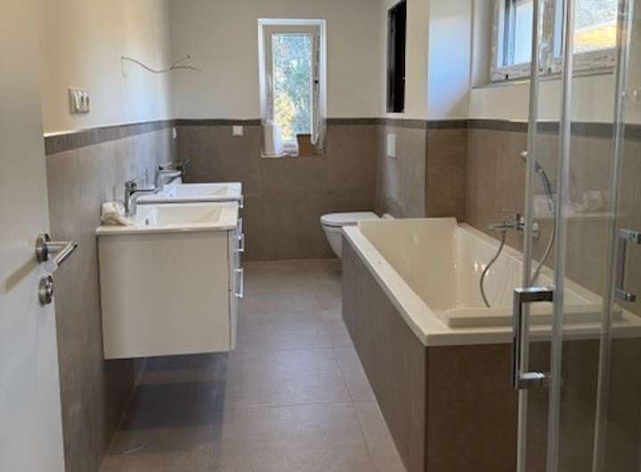 - Bad mit großformatigen Fliesen, Wanne und Dusche und Echtglasabtrennung