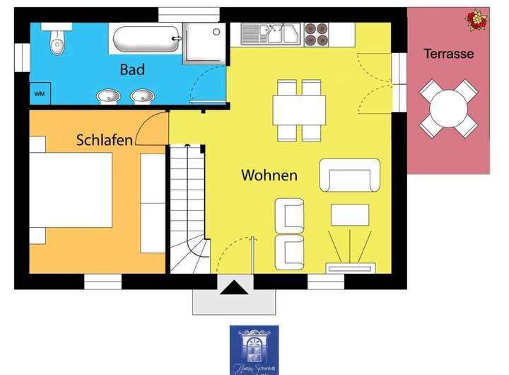 Auf der Wohnebene im Erdgeschoss, welche modern gefliest ist, befinden sich das helle Wohnzimmer mit offener Küche und moderner EBK und Zugang auf die herrliche Terrasse und in den Garten. Hier können Sie wunderbar entspannen und gemütliche Stunden mit Freunden oder der Familie verbringen. Auch das optimal geschnittene Schlafzimmer als auch das exklusive Tageslichtbad mit Wanne, Dusche und Waschmaschinenanschluss finden Sie auf dieser Ebene.
