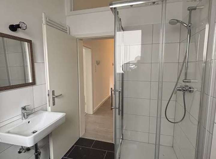 Badezimmer: frisch renoviert, modern gestaltet, mit gefliester Dusche sowie Anschluss für eine Waschmaschine