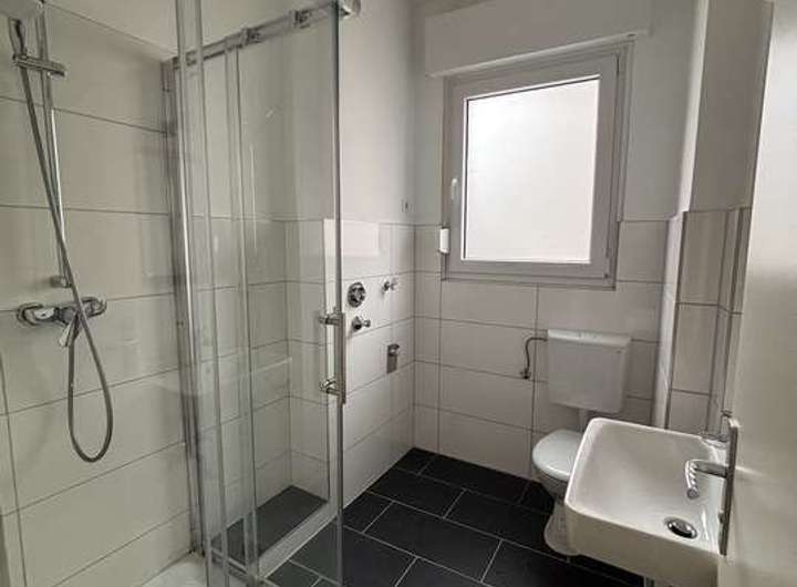 Das modern renovierte Badezimmer verfügt über eine Dusche, ein Waschbecken sowie einen Waschmaschinenanschluss und profitiert ebenfalls von einem Fenster, das für angenehmes Tageslicht sorgt.