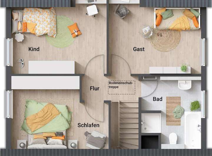 Das Flair 113 ist nicht ohne Grund das meistgekaufte Town & Country Haus. Es bietet alles, was ein Massivhaus gemütlich macht. Im Erdgeschoss betreten Sie ein komfortables, geräumiges Wohn- und Esszimmer, eine Küche mit genügend Freiraum, ein Gäste-WC und einen Hauswirtschaftsraum mit ausreichend Platz für Waschmaschine und Co. Im Dachgeschoss erwarten Sie neben drei weiteren geräumigen Zimmern ein komfortabel ausgestattetes Badezimmer.