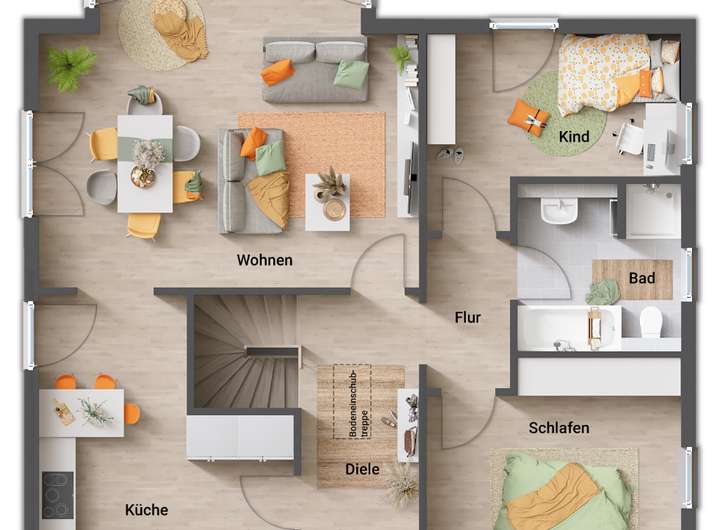 Ihr Haus wird schlüsselfertig übergeben, d.h. Sie gestalten nur noch die Innenwände in Ihrer Lieblingsfarbe und verlegen die übrigen Bodenbeläge!