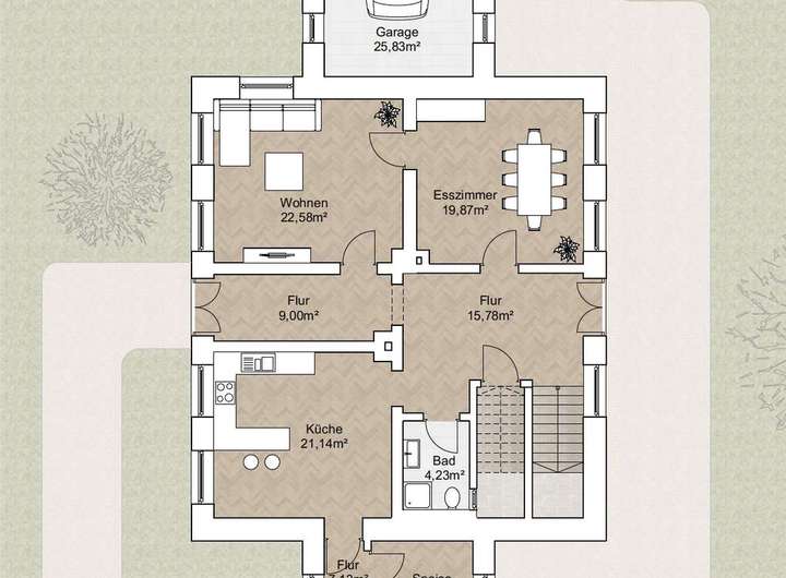 Geradeaus vom Eingangsbereich erreichen Sie die Garderobenzone. Seitlich davon liegt die große, helle Essküche. Hier ist genügend Platz für einen Familientisch, an dem sich das tägliche Leben abspielt. Von der Küche führt ein kleiner Flur weiter in die angrenzende Speisekammer – perfekt für Vorräte – sowie in den Hauswirtschafts- bzw. Heizraum, in dem Waschmaschine, Trockner und Haustechnik ihren Platz finden. Kurze Wege und durchdachte Nebenräume machen das Erdgeschoss besonders alltagstauglich.