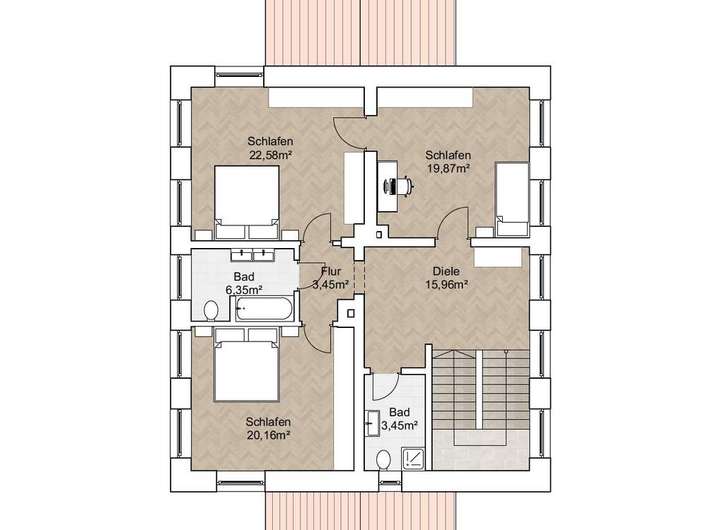 Über die Treppe gelangen Sie in die zentrale Diele des Obergeschosses. Von hier erschließen sich drei äußerst großzügige Schlafzimmer, die dank ihrer angenehmen Größen auch viel Stellfläche für Schränke, Kommoden oder einen Arbeitsplatz bieten. Zwei Bäder – eines mit Wanne, eines kompakter geschnitten – sorgen dafür, dass morgens kein Stau entsteht und jedes Familienmitglied genügend Rückzugsraum hat.