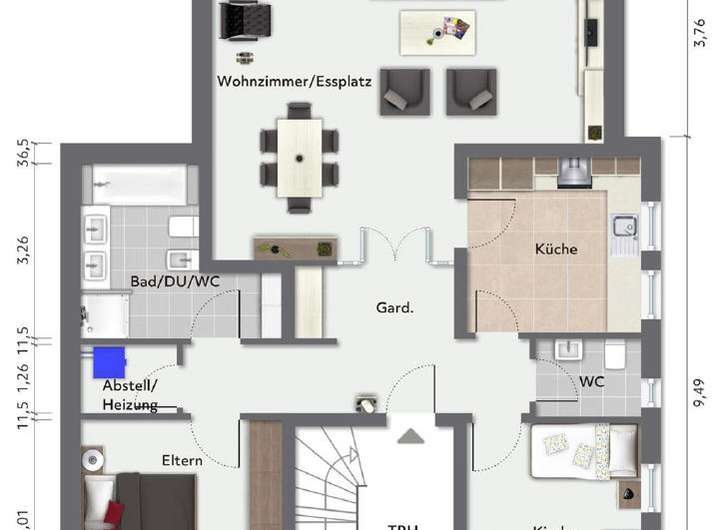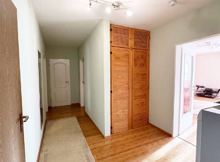 Die Wohnung besteht aus einem großen Wohn- und Esszimmer in L-Form und vorgelagertem und überdachten Südbalkon. Aufgrund der großen Fensterflächen wirken alle Räume hell und freundlich. Das Gäste-WC mit Tageslicht erscheint in modernem Look, ebenso die Küche (kann gegen Ablöse übernommen werden). Das Schlafzimmer und das Kinderzimmer/Home-Office/Gästezimmer haben eine ausgewogene Größe.