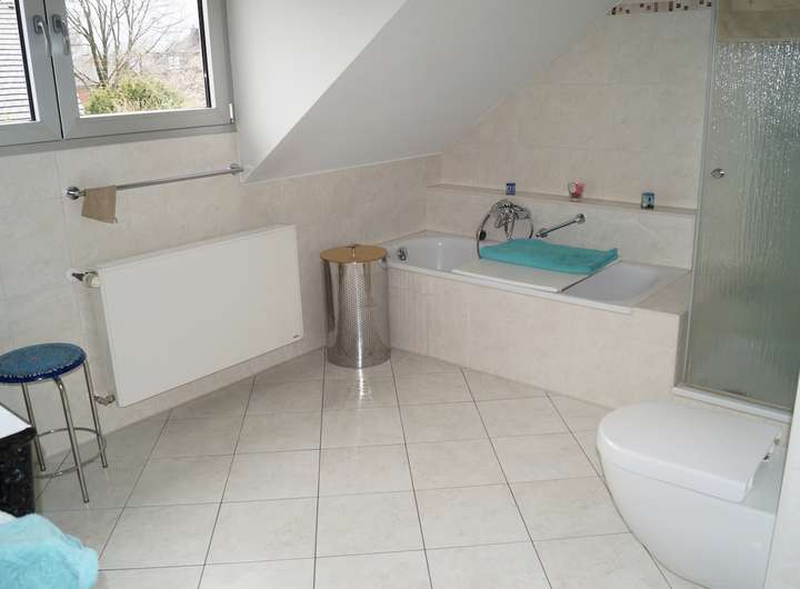In der ersten Etage befindet sich neben dem Tagelichtbad, welches mit Badewanne und Dusche ausgestattet ist, das Elternschlafzimmer mit Zugang auf den Balkon und zwei weitere Kinder- oder Arbeitszimmer.