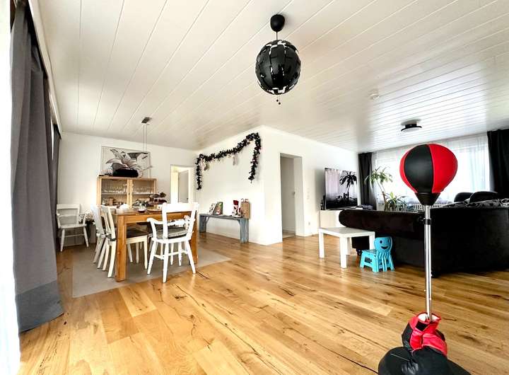 Vom geräumigen Eingangsbereich aus gelangen Sie in die Küche, in ein Arbeitszimmer, das Gäste-WC und in das große und helle Wohn- und Esszimmer mit direktem Zugang zur Terrasse und in den großzügig angelegten Sonnengarten.