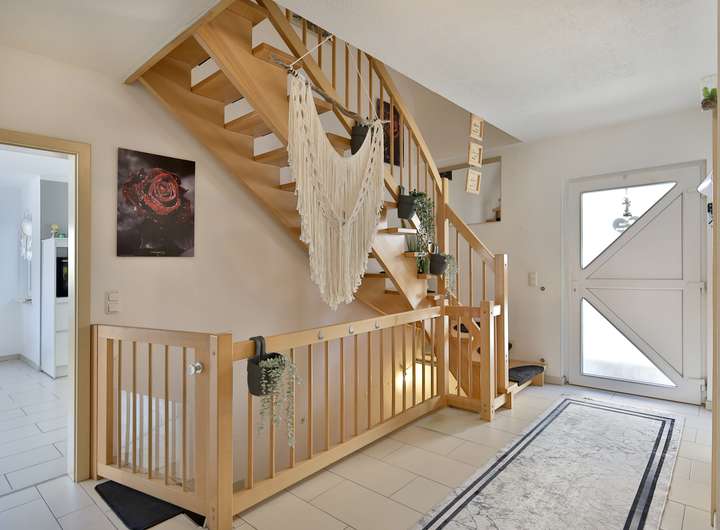Dieses moderne Einfamilienhaus aus dem Jahr 2008 überzeugt durch eine durchdachte Raumaufteilung und eine helle, einladende Atmosphäre. Auf rund 150 m² Wohnfläche, verteilt auf drei Etagen, bietet es mit insgesamt fünf Zimmern viel Platz für die ganze Familie. Das ca. 320 m² große Grundstück lädt zum Wohlfühlen und Entspannen ein. Die hochwertige Einbauküche mit eleganter Steinarbeitsplatte und großem amerikanischen Kühlschrank stellen ein besonderes Highlight dar. Im Erdgeschoss empfängt Sie ein großzügiger Eingangsbereich, von dem aus Sie den praktischen Hauswirtschaftsraum, ein modernes Tageslichtbad mit Dusche sowie ein geräumiges Schlafzimmer erreichen. Das Herzstück des Hauses bildet der offene Wohn- und Essbereich mit angrenzender Wohnküche in zeitlosem, hellem Design. Große, teils bodentiefe Fenster durchfluten den Raum mit Licht und schaffen einen harmonischen Übergang zur großen, sonnigen Terrasse, die zu entspannten Stunden im Freien einlädt. Im Obergeschoss erwarten Sie drei gut geschnittene Schlafzimmer mit Zugang zu einem Balkon mit schöner Aussicht. Das großzügige Tageslichtbad ist modern gestaltet und verfügt über eine Eckbadewanne sowie eine Dusche. Im Untergeschoss befinden sich neben den üblichen Kellerräumen eine Werkstatt sowie ein großer Hobbyraum, der vielseitige Nutzungsmöglichkeiten bietet. Dieses Einfamilienhaus vereint Komfort, Qualität und eine behagliche Wohnatmosphäre. Es handelt sich um ein Fertighaus der Firma Massa.