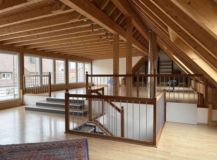 Eine Treppe führt in das Dachgeschoss, in dem sich eine große offene Galerie mit vielen Fenstern befindet. Dieser Bereich kann vielseitig genutzt werden, z. B. als Arbeits-, Gäste- oder Hobbybereich. Es besteht zudem die Möglichkeit, durch das Einziehen von Wänden zusätzliche Räume abzutrennen.