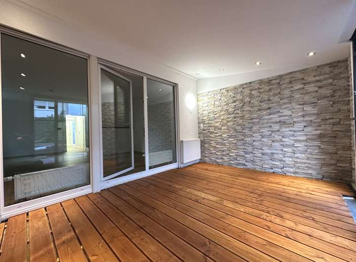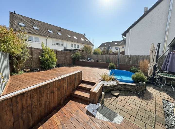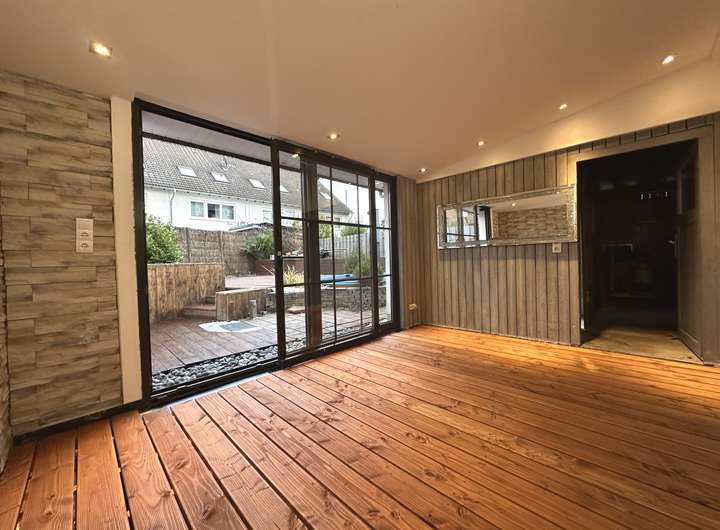 Der Wintergarten führt direkt in den liebevoll gestalteten Garten, der überwiegend mit einem Bangkirai-Boden ausgestattet ist – perfekt für entspannte Stunden im Freien. Vom Garten und Wintergarten gelangt man außerdem in eine kleine Werkstatt, die praktischerweise ebenfalls mit dem Geräteschuppen verbunden ist.