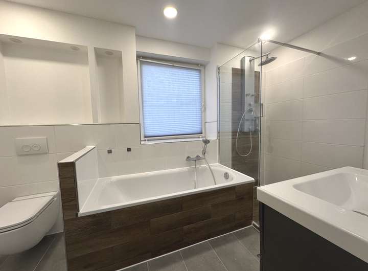 * modernes Badezimmer mit Badewanne, Dusche und Waschmaschinenanschluss