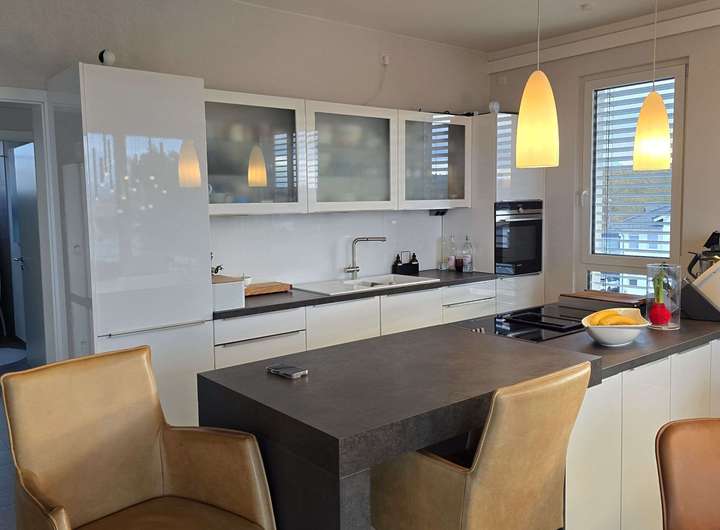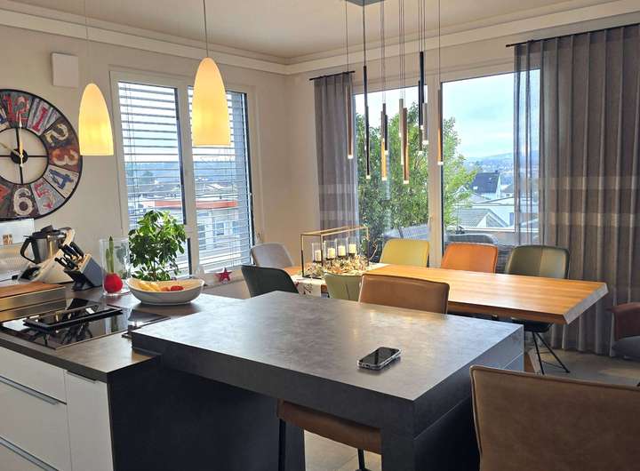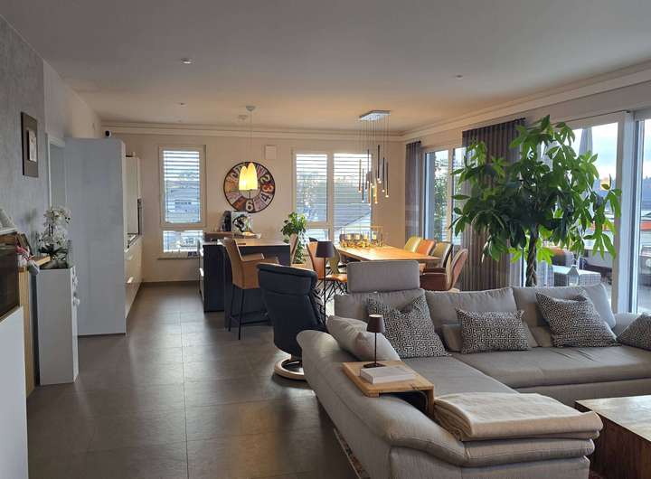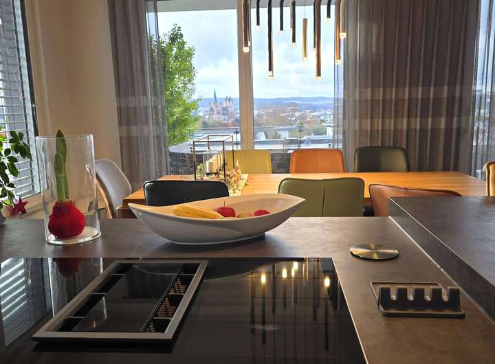 Der sonnendurchflutete Wohn-Essbereich mit offener Küche und Thekenbereich erzeugt beim Betreten sofort einen "Wow-Effekt". Durch die bodentiefen Fensterelemente auf der gesamten Front haben Sie einen einzigartigen Blick über die große Dachterrasse auf Limburg und den Dom.