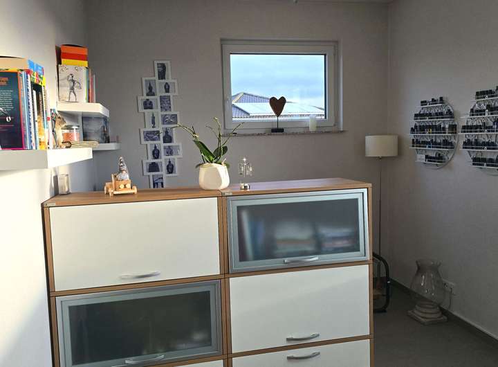 Über den offenen Wohn-Essbereich gelangt man in das hintere Büro- oder Kinderzimmer. Hier befindet sich ein helles Gäste-Duschbad.