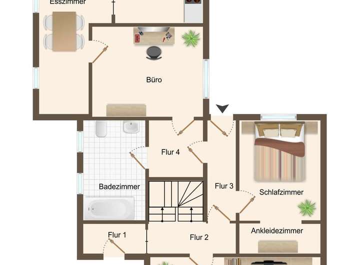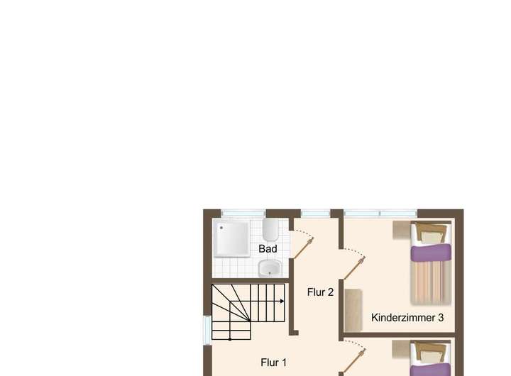 Im Erdgeschoss erwartet Sie ein lichtdurchflutetes Wohnzimmer, das mit seiner Großzügigkeit begeistert. Ein Schlafzimmer und das moderne Bad mit Wanne und Dusche ergänzen die Etage perfekt.