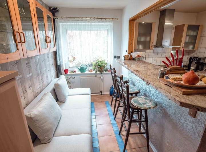 Im Erdgeschoss erwartet Sie ein offener Wohn- und Essbereich mit Kamin für gemütliche Stunden, eine lichtdurchflutete Küche mit Sitzgelegenheit sowie ein Gäste-WC.