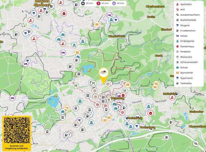 Die Immobilie befindet sich in einer attraktiven Lage in Bergisch Gladbach, im Stadtteil Bensberg. Die Umgebung zeichnet sich durch eine hervorragende Anbindung an den öffentlichen Nahverkehr aus, mit mehreren Bushaltestellen in fußläufiger Entfernung. Die nächste Bahnstation ist ebenfalls bequem erreichbar, was eine schnelle Verbindung in die umliegenden Städte ermöglicht.