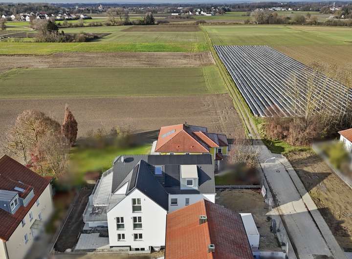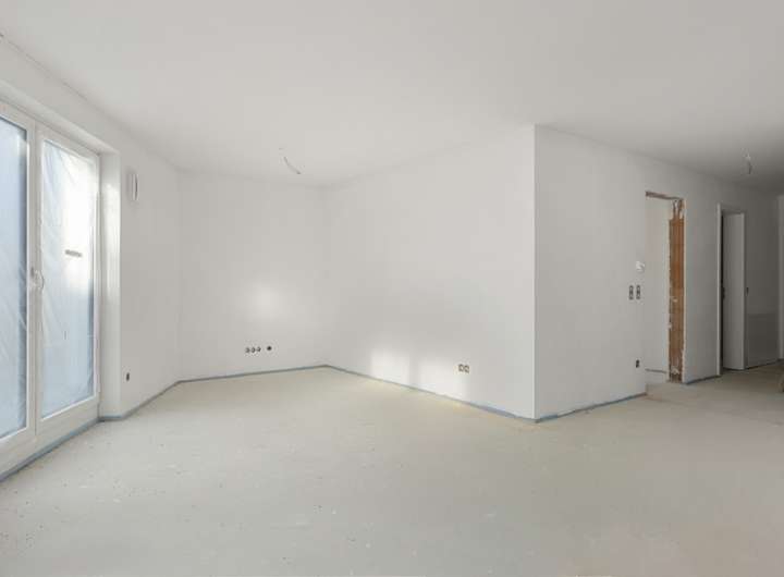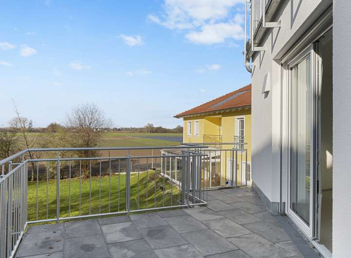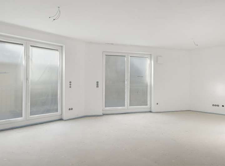 Die Wohnung überzeugt durch einen durchdachten und funktionalen Grundriss. Der zentrale Flur verbindet alle Räume miteinander und schafft eine klare Struktur. Der großzügige Wohn- und Essbereich bildet das Herzstück der Wohnung und öffnet sich zur großen Dachterrasse, die einen weiten Blick ins Grüne über die angrenzenden Felder ermöglicht. Die offene Kochnische fügt sich harmonisch in den Raum ein. Zwei gut geschnittene Schlafzimmer bieten flexible Nutzungsmöglichkeiten. Ob als Schlaf-, Kinder- oder Arbeitszimmer. Angrenzend an das Hauptschlafzimmer befindet sich eine praktische Ankleide, die zusätzlichen Stauraum schafft. Das Tageslichtbad ist modern gestaltet und mit einer bodengleichen Dusche und einer Badewanne ausgestattet. Ein Abstellraum innerhalb der Wohnung sorgt für weitere Ordnung im Alltag.