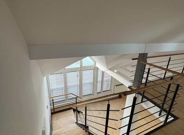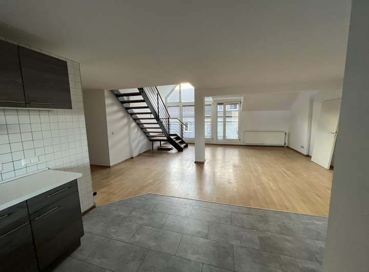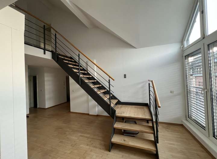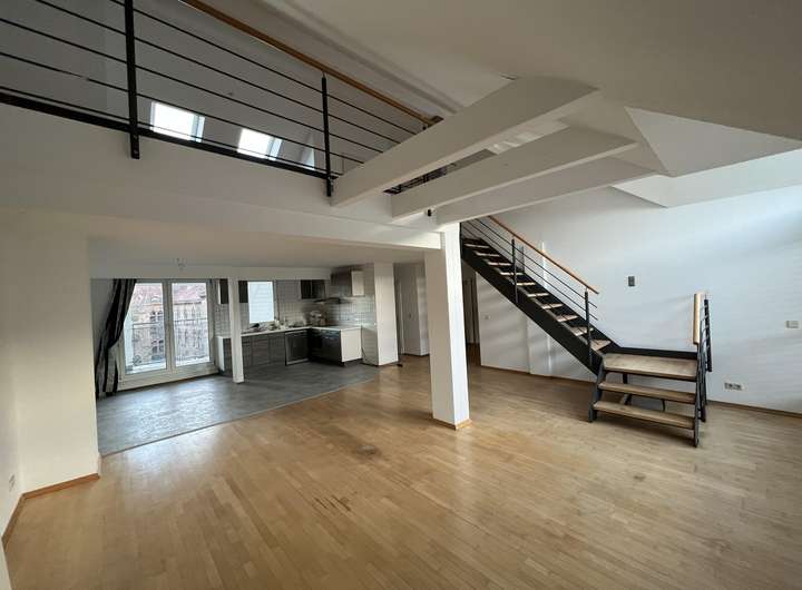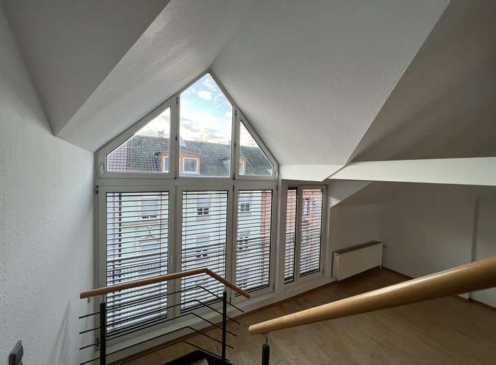 Sehr großzügige und helle Maisonetten- Loftwohnung im Hemshof in Ludwigshafen. Wohnfläche: ca. 125 m². Es gibt einen begehbaren Kleiderschrank mit viel Stauraum. Zudem eine große Loggia, welche sich an den Küchen- und Wohnbereich in der unteren Ebene anschließt.