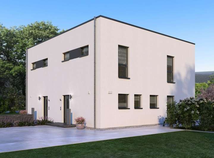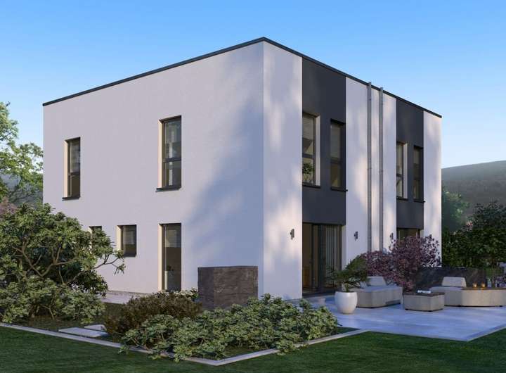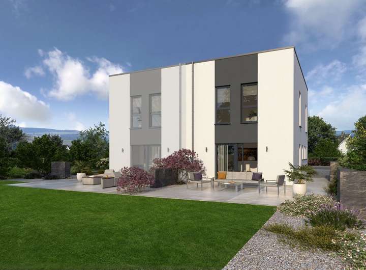 Purismus pur - dafür steht unser Doppelhaus 06. Allerdings spiegelt sich dieser Purismus nur in der schnörkellosen kubistischen Bauweise mit modernem Flachdach und symmetrischer Fassadengestaltung, nicht aber im Wohlfühlcharakter wider. Die beiden identisch konzipierten Wohneinheiten verfügen jeweils über eine Wohnfläche von rund 120 m2, verteilt auf zwei Etagen. Im Erdgeschoss führt der Weg durch die offen gestaltete Diele direkt ins Wohn-Ess-Zimmer mit integriertem Küchenbereich. Durch das offene Raumkonzept wird ein Gefühl von Größe und Weite vermittelt, das durch die großen Türfronten, die unmittelbar in den Garten führen, noch verstärkt wird. Parterre befinden sich zudem ein Gäste-WC und ein Hauswirtschaftsraum. Das Obergeschoss: Dank des Flachdaches kann der Raum maximal genutzt werden - und das in einem Elternschlafzimmer, den beiden Kinderzimmern sowie im geräumigen Bad, das ausreichend Platz für Wanne, Dusche und WC bietet. Im Doppelhaus 06 gehen Purismus und Behaglichkeit eine perfekte Symbiose ein.