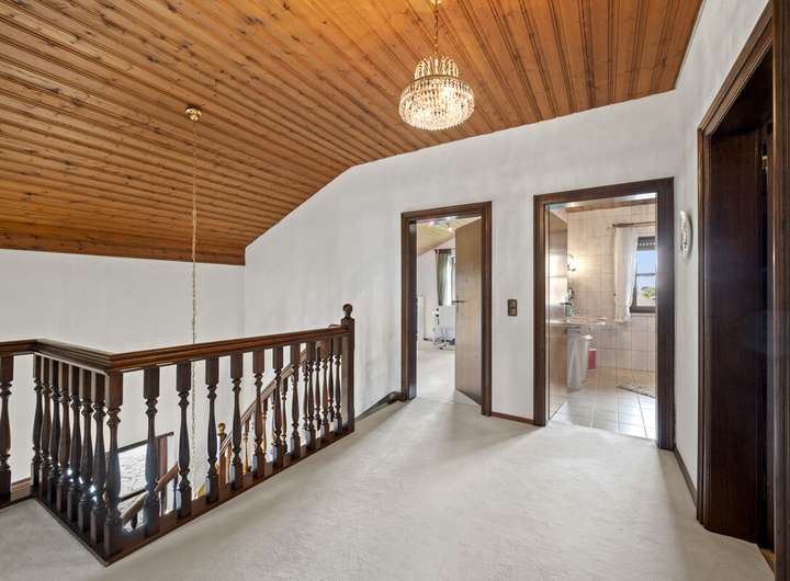 Im Obergeschoss befinden sich drei Schlafzimmer, ein Abstellraum sowie ein Badezimmer mit zwei Waschbecken, Bidet und Eckwanne. Die Wohnräume und der Flur sind mit Teppichboden ausgestattet, das Bad ist gefliest.