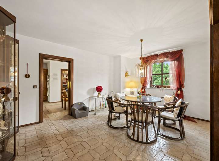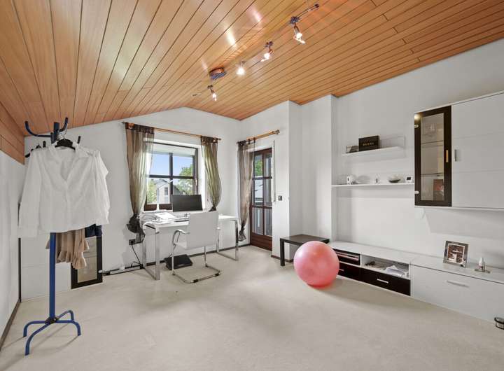 Im Erdgeschoss erwartet Sie ein helles Wohnzimmer mit einer riesigen Fensterfront, die für viel Licht und einen schönen Blick in den Garten sorgt. Ein zur Küche und zum Wohnzimmer offenes Esszimmer bietet zusätzlichen Raum für gesellige Abende. Die rustikale Einbauküche mit gemütlicher Sitzecke lädt zum Kochen ein. Ein Gästezimmer, das sich auch als Büro eignet, ergänzt das Raumangebot. Das Badezimmer ist mit einer neuen barrierearmen Dusche und zwei Waschbecken ausgestattet, ein separates WC sorgt für zusätzlichen Komfort. Das Gästezimmer verfügt über neuen Laminat, alle anderen Räume im Erdgeschoss sind mit hochwertigen und pflegeleichten Fliesen ausgestattet.