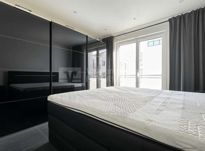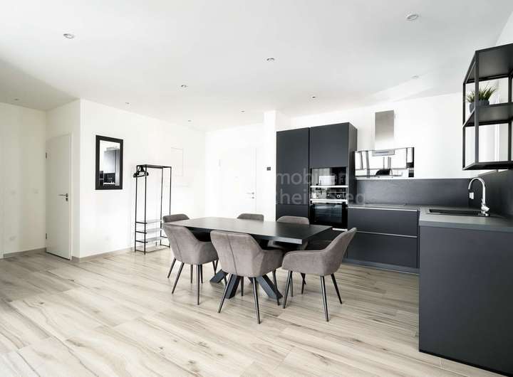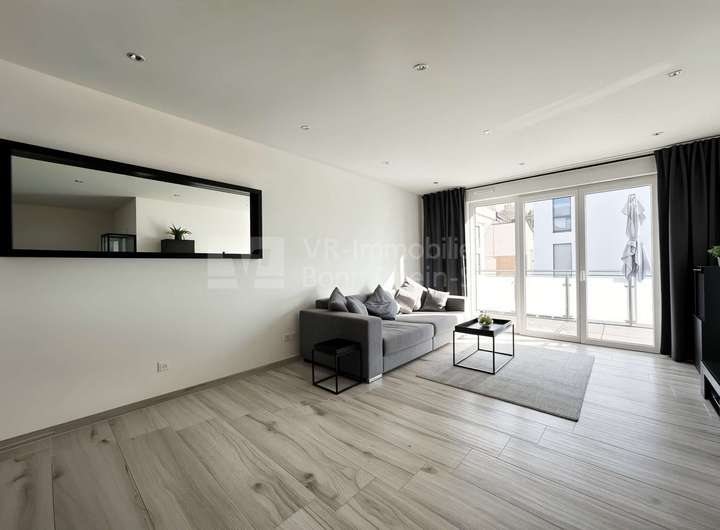 Möblierte 2-Zimmerwohnung im Neubau im ersten Obergeschoss mit Aufzug und Tiefgarage.