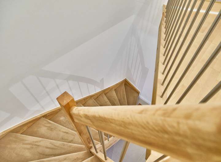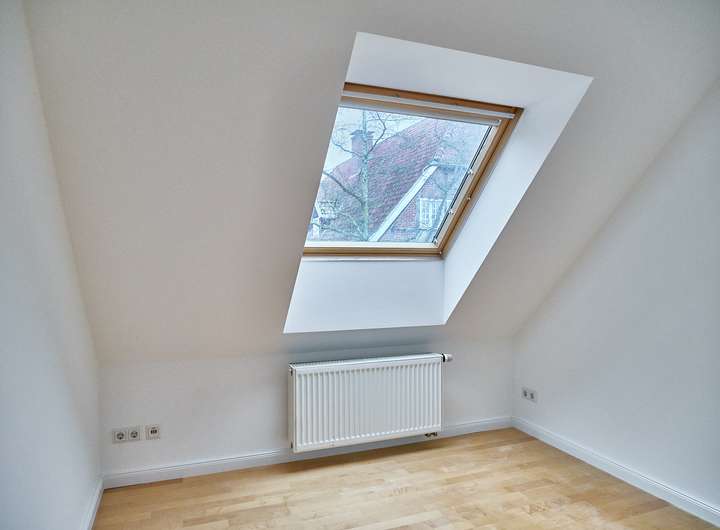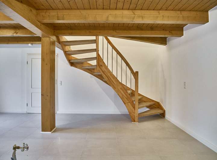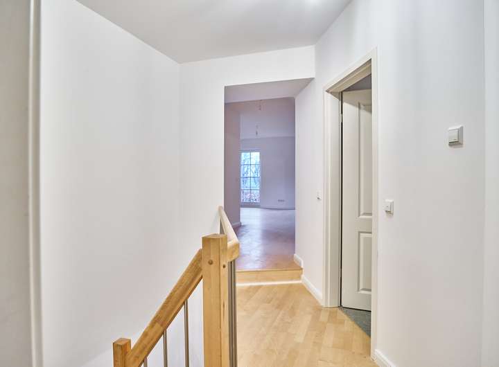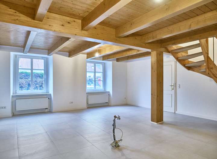 Sichtbare Holzbalken, die massive Holztreppe und der zugehörige Gartenbereich runden das stimmige Gesamtbild dieser besonderen Maisonettewohnung ab.