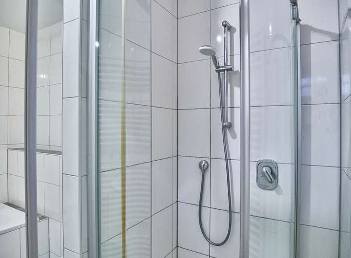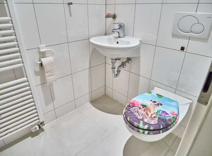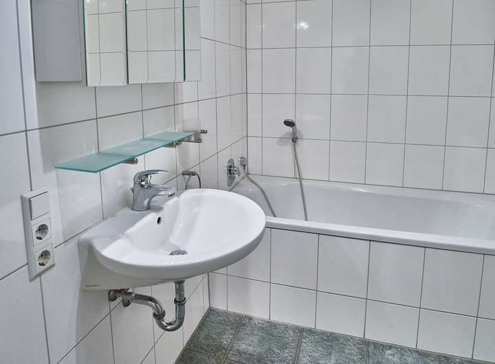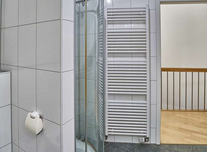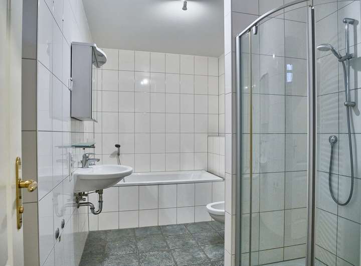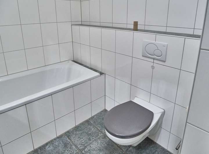 Das Tageslichtbad verfügt über Badewanne und separate Dusche; das zusätzliche WC ist in ähnlicher, heller Optik gefliest. Beheizt wird die Wohnung klassisch über Heizkörper, eine Fußbodenheizung ist nicht vorhanden.