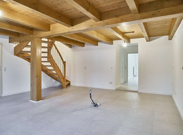 Bereits beim Betreten des Hauses gelangt man über den Flur in den weitläufigen Wohn- und Essbereich mit offener Küchensituation. Der komplette Bereich wurde frisch modernisiert und mit einem neuen, großformatigen, hellen Fliesenboden ausgestattet – pflegeleicht, zeitlos und ideal für Familien oder Paare, die großzügige Räume schätzen. Die sichtbaren Holzbalken an Decke und Stützen sowie die massive Holztreppe ins Obergeschoss verleihen dem Erdgeschoss eine gemütliche, fast loftartige Atmosphäre.