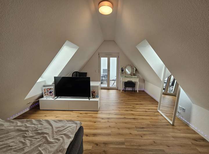 Vom Küchenbereich gelangen Sie auf den Ostbalkon auf dem man mit Morgensonne genüsslich frühstücken kann (der Bäcker ist gleich nebenan!). Durch den Wohnbereich gelangen Sie auf die überdachte Loggia, wo Sie den Feierabend und die Wochenenden bei schönen Grillabenden genießen können. Eine Treppe führt Sie vom Wohnbereich ins Dachgeschoss. Dort befindet sich die Dachterrasse mit einem fantastischen Ausblick.