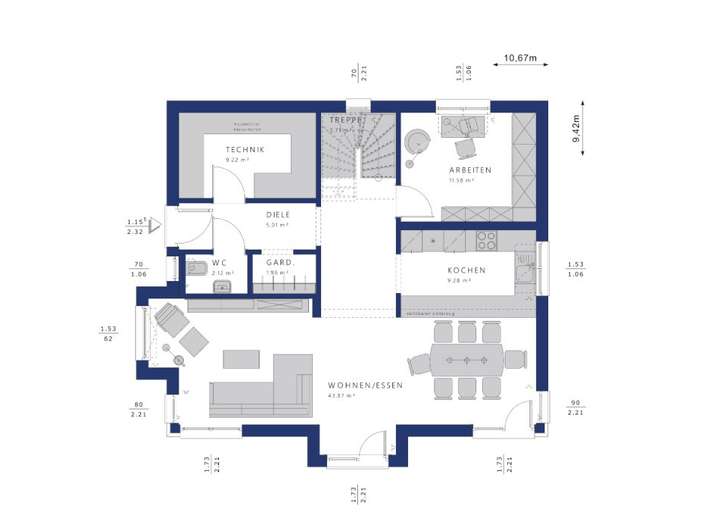 Das Haus besticht durch seine durchdachte Raumaufteilung, die sowohl gemeinsame Begegnungen als auch individuelle Rückzugsmöglichkeiten schafft. Im Erdgeschoss finden Sie offene Bereiche für Familienleben und Arbeiten, während das Obergeschoss private Rückzugsorte und persönliche Räume bietet. Jeder Winkel wurde mit Bedacht geplant, um maximale Funktionalität und Wohnkomfort zu gewährleisten.