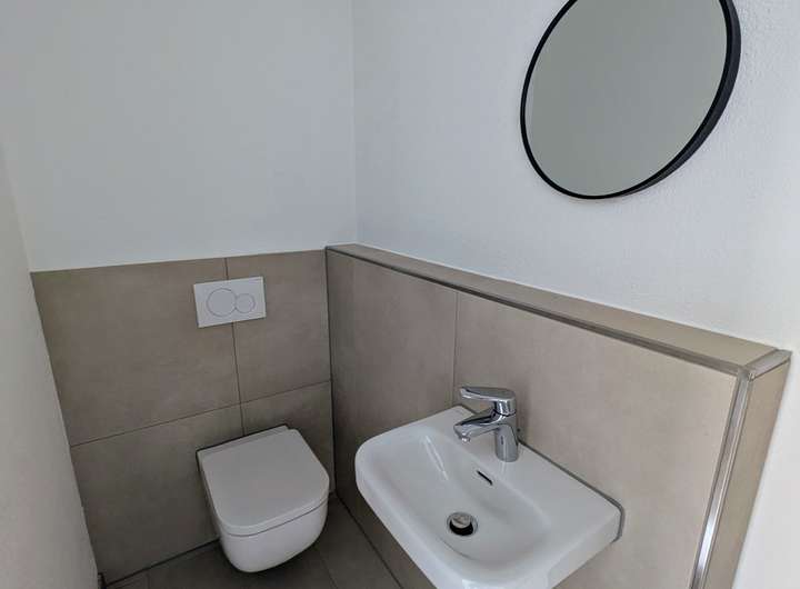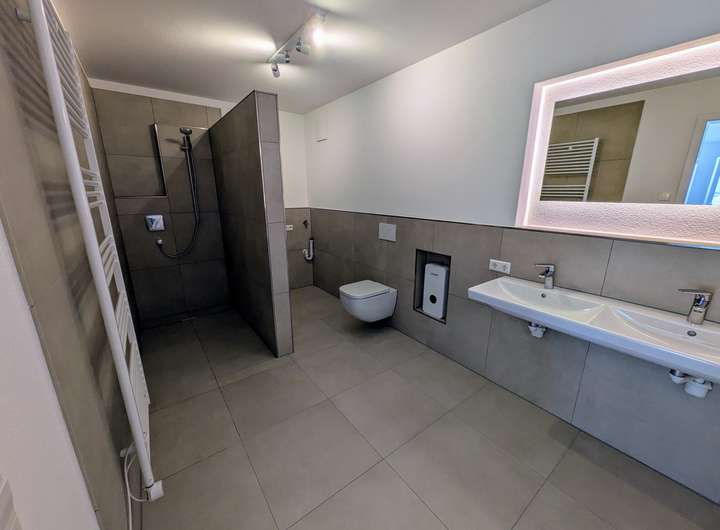 Das Badezimmer ist mit einer ebenerdigen Dusche, einem Doppelwaschtisch, einem elektrischen Handtuchhalter sowie einem Wand-WC ausgestattet. Er-gänzt wird dies durch ein separates Gäste-WC und einen praktischen Haus-wirtschaftsraum mit Anschluss für Waschmaschine und Trockner.