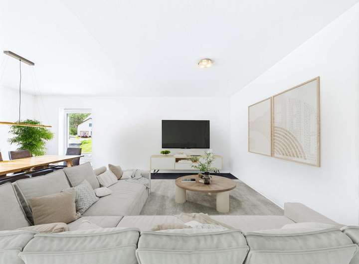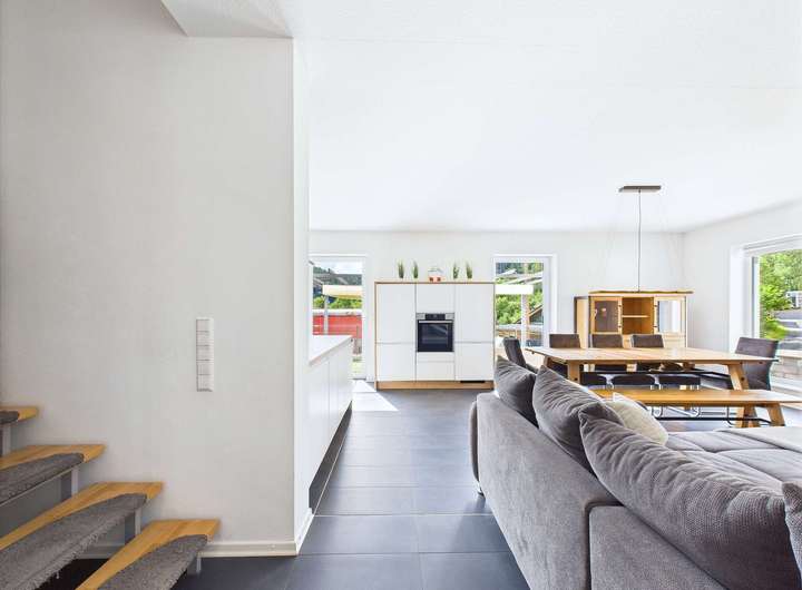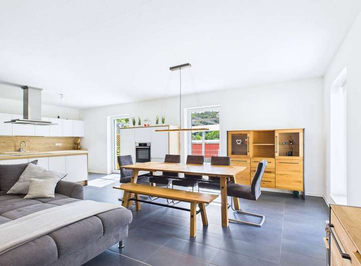 Im Eingangsbereich bietet eine praktische Wandnische Platz für Ihre Garderobe. Der anschließende Flur führt in den großzügigen Wohn- und Essbereich, der dank offener Gestaltung ein helles und einladendes Ambiente schafft. Zeitlose Fliesen im Format 60 × 30 cm unterstreichen den modernen Charakter. Die offene Küche fügt sich harmonisch an und bildet das Herzstück des Hauses – ein idealer Treffpunkt für Familie und Freunde.