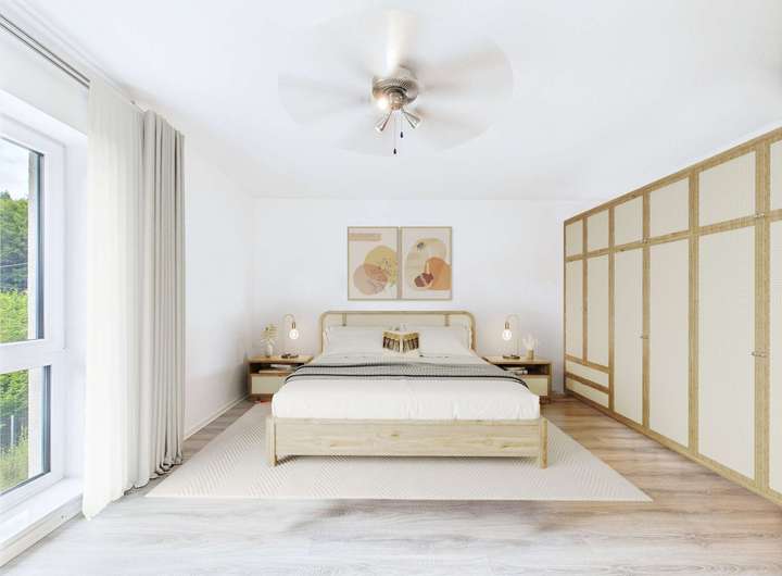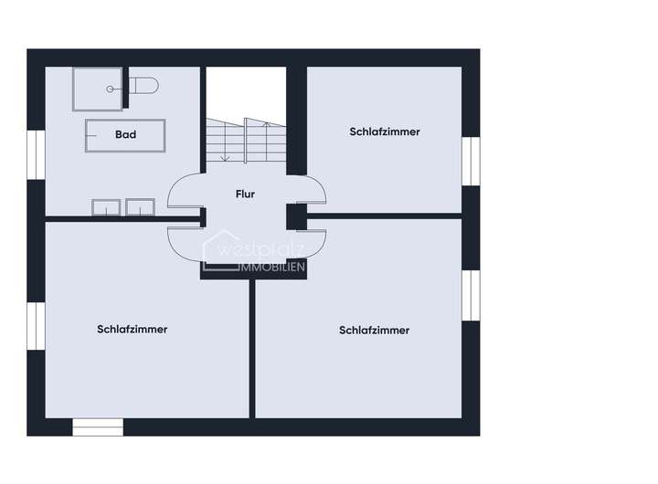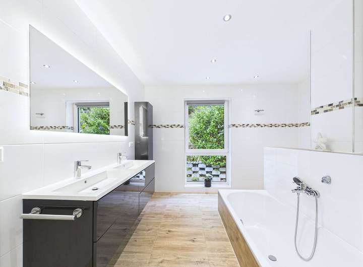 Das Obergeschoss beherbergt drei optimal geschnittene Schlafzimmer sowie ein lichtdurchflutetes Badezimmer mit Doppelwaschbecken, Walk-In-Dusche und Badewanne.