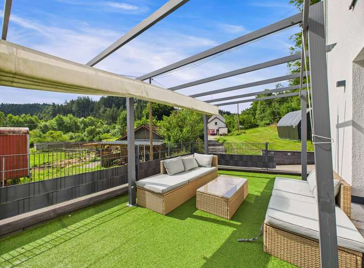 Die überdachte Südterrasse lädt zu entspannten Mahlzeiten, sonnigen Nachmittagen oder geselligen Abenden ein. Eine Garage sowie zwei Außenstellplätze sorgen für komfortables Parken.