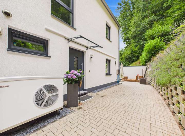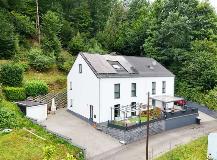 Diese stilvolle Doppelhaushälfte im idyllischen Neuhöfer Tal bei Trippstadt wurde 2017 errichtet und vereint modernes Wohnen mit durchdachter Architektur, hochwertiger Ausstattung sowie einem klaren Fokus auf Energieeffizienz und Wohnkomfort.